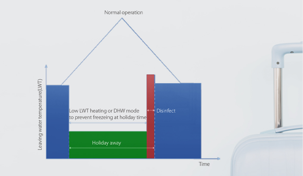 Režim dovolenky zvyšuje spoľahlivosť systému a pomáha šetriť energiu. Zariadenie pracuje v režime vykurovania a/alebo prípravy teplej vody s nízkou teplotou, aby sa zabránilo zamrznutiu počas vašej neprítomnosti. Používateľ môže vopred nastaviť dezinfekčný režim, aby bola po návrate k dispozícii hygienicky nezávadná teplá voda.