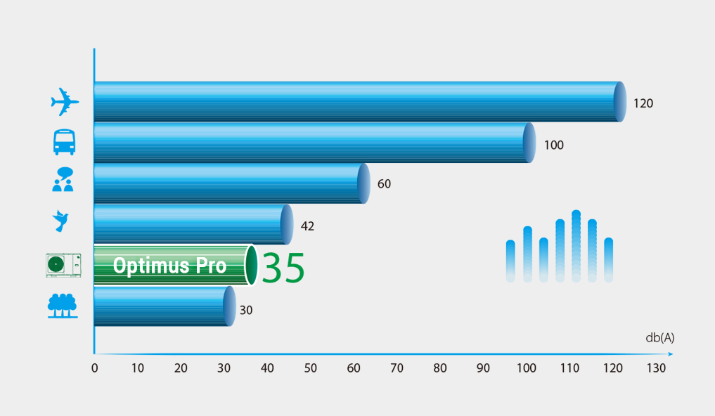 Vďaka vysokej úrovni optimalizácie technických riešení dosahuje hladina akustického tlaku jednotiek NØRDIS Optimus Pro 4 kW iba 35 dB(A) vo vzdialenosti 3 metrov.