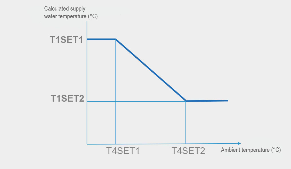 Pomocou funkcie ekvitermickej krivky sa teplota vody automaticky prispôsobuje zmenám vonkajšej teploty. Keď vonkajšia teplota stúpa alebo klesá, vykurovacie zaťaženie sa znižuje alebo zvyšuje a teplota vody sa tomu automaticky prispôsobuje. Rovnako pri chladení – pri zmene vonkajšej teploty sa mení chladiace zaťaženie aj teplota vody.